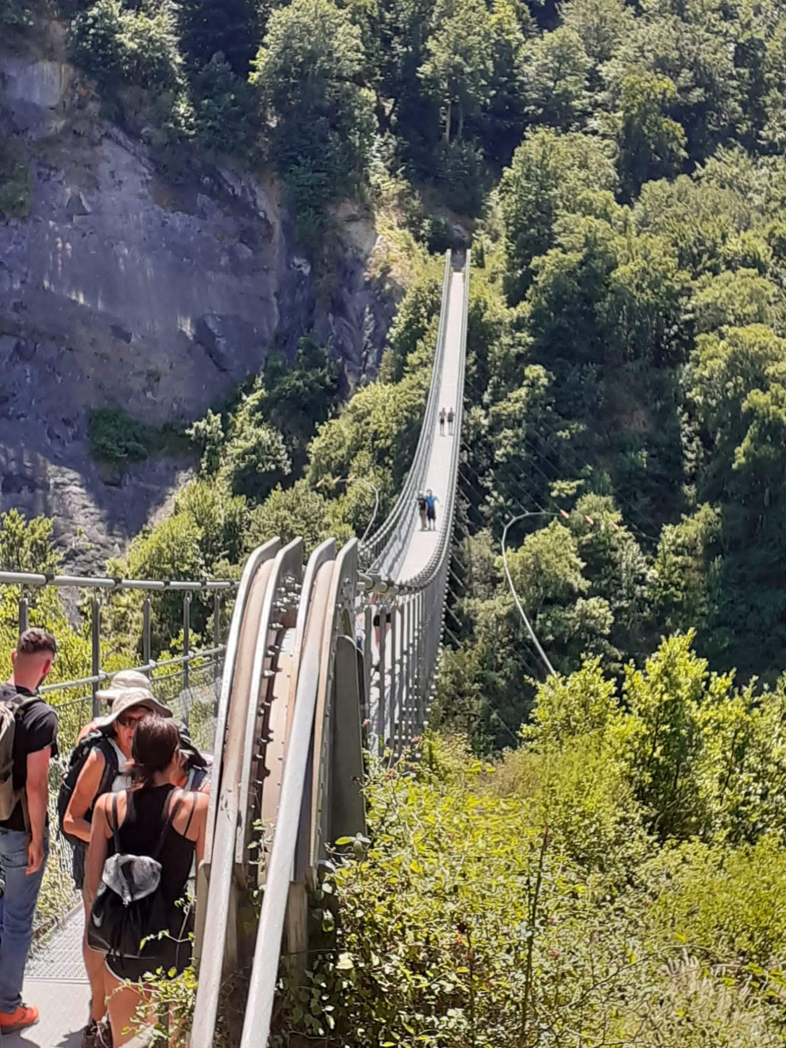 Départ de la randonnée depuis la plage de Treffort avec le passage de 2 impressionnantes passerelles himalayennes (mais sécurisées) qui enjambent les gorges du de l’Ebron et du Drac. (entre 45m à 80 m au-dessus des gorges selon hauteur des eaux, longues de 180 et 220m) .