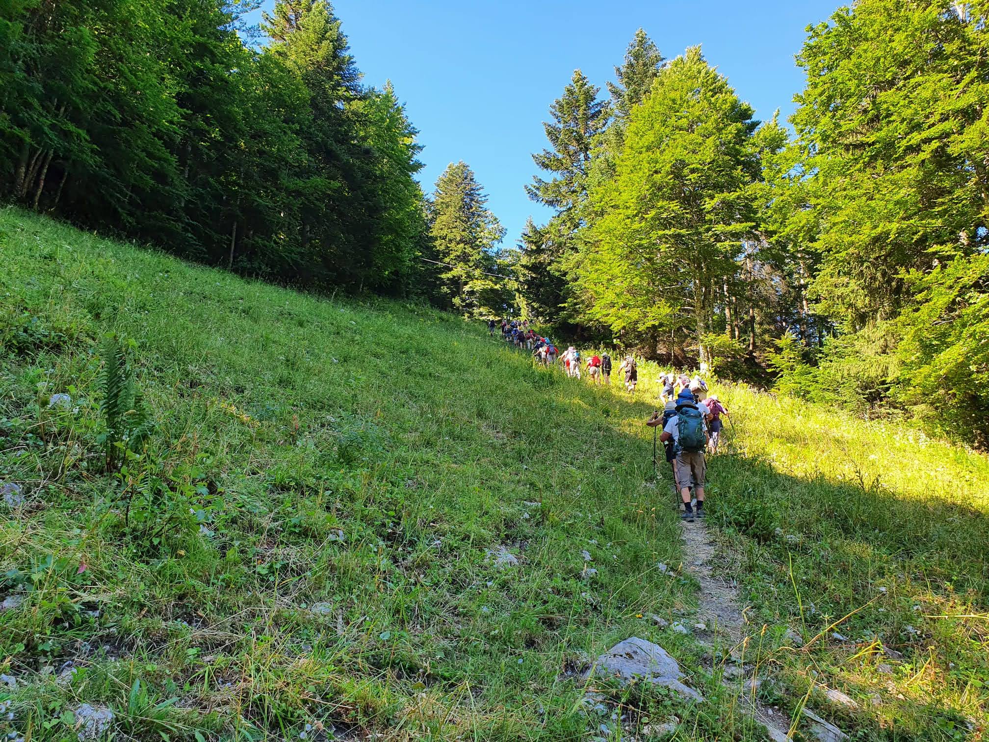 Ce dimanche 17 juillet dernier, un groupe de 42 marcheurs de Rando Saint Martin est parti de Menthières pour une randonnée en boucle en passant son point culminant, le crêt de la Goutte à 1621m. Ce sommet permet d’observer un panorama magnifique sur 360° notamment avec vue sur le massif du mont Blanc et le lac de Genève. La boucle continue avec une vue sur Bellegarde et les méandres du Rhône. Au loin, le Grand Colombier. Notre cheminement nous conduit au chalet de Varambon à proximité immédiate de la Réserve naturelle nationale de la Haute Chaîne du Jura. Après une petite pause, le groupe fait sa dernière ascension vers la pierre à Fromage pour entamer enfin sa descente vers le chalet du Sac puis les pistes de ski qui conduisent à Menthières. Après une randonnée d’environ 6 heures et 750m de dénivelée, les marcheurs se sont retrouvés à leur point de départ pour le pot de l’amitié puis le retour en bus vers Saint Martin du Mont.