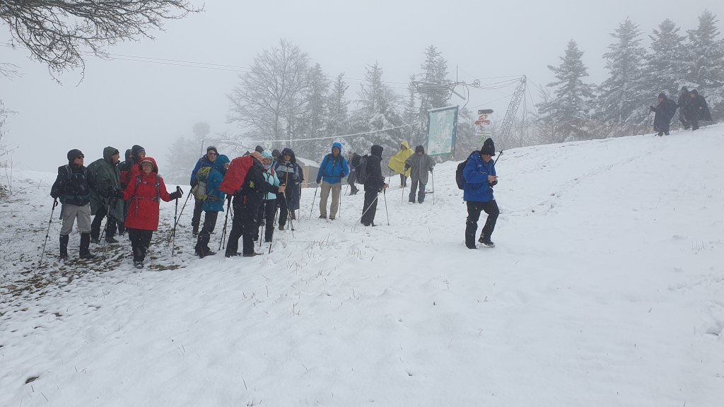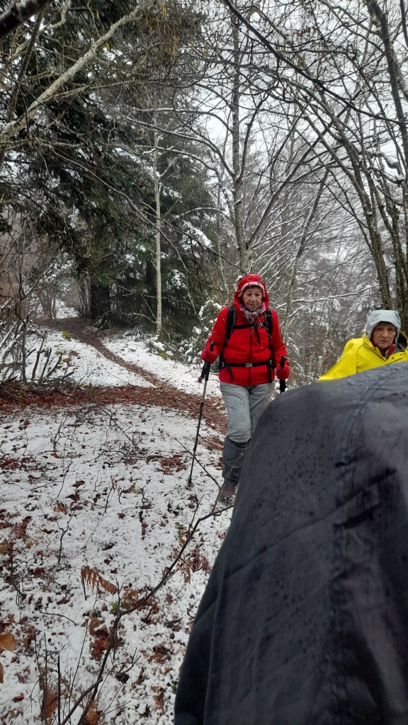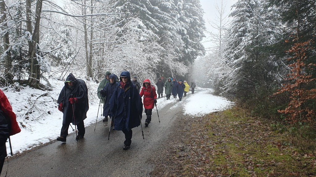 Vu la douceur de ces derniers jours, la sortie raquette à Hauteville prévue au calendrier annuel s’est muée en randonnée pédestre. La surprise fut totale en découvrant le site de La Praille couvert d’une pellicule blanche. Mais vu l’épaisseur de neige insuffisante les 32 randonneurs ont parcouru sans raquettes 10 et 14 km sur les crêtes dominant la station et séparant le plateau d’Hauteville du Valromey.