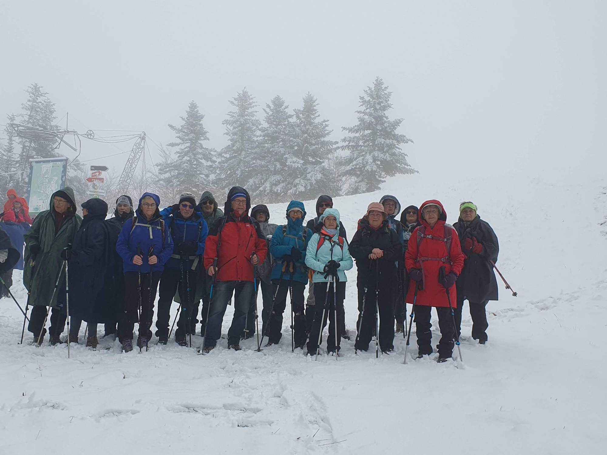 Vu la douceur de ces derniers jours, la sortie raquette à Hauteville prévue au calendrier annuel s’est muée en randonnée pédestre. La surprise fut totale en découvrant le site de La Praille couvert d’une pellicule blanche. Mais vu l’épaisseur de neige insuffisante les 32 randonneurs ont parcouru sans raquettes 10 et 14 km sur les crêtes dominant la station et séparant le plateau d’Hauteville du Valromey.