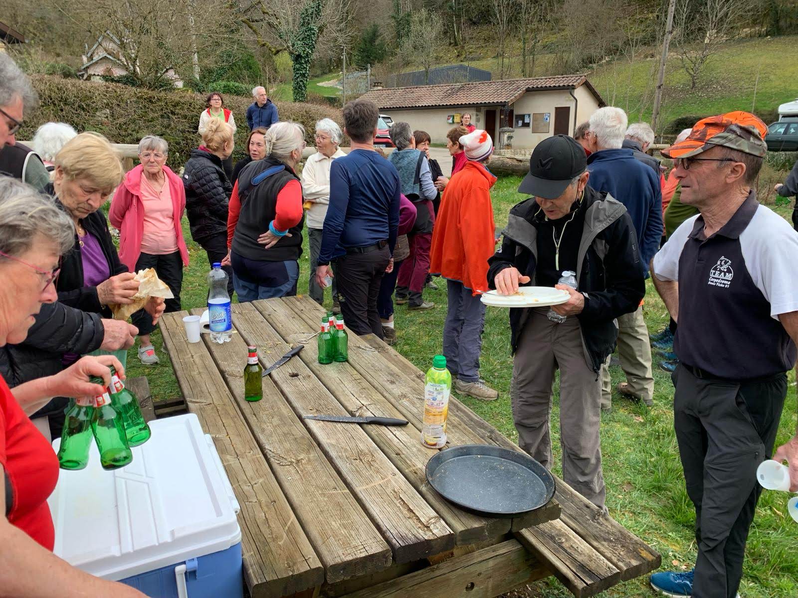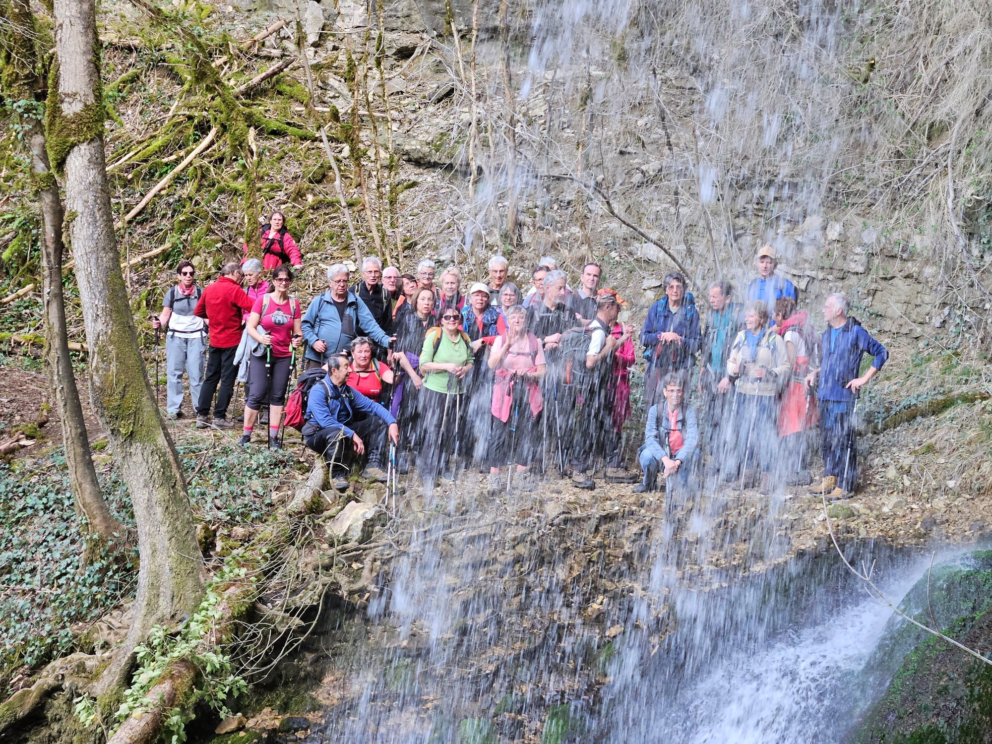42 personnes se sont rendues en covoiturage sur les rives de l’Ain à Bombois Les randonneurs ont suivi la berge rive gauche de l’Ain pour gagner le village de Granges avant de gravir la côte pour atteindre la plateau du Berthiand. Après avoir traversé le village de Sonthonnax la Montagne et la pause piquenique à Hériat, ils ont rejoint le point de départ en passant par le site de la cascade de « Pisse Vache » qui permet au ruisseau éponyme de franchir une barre rocheuse avant de rejoindre la rivière d’Ain