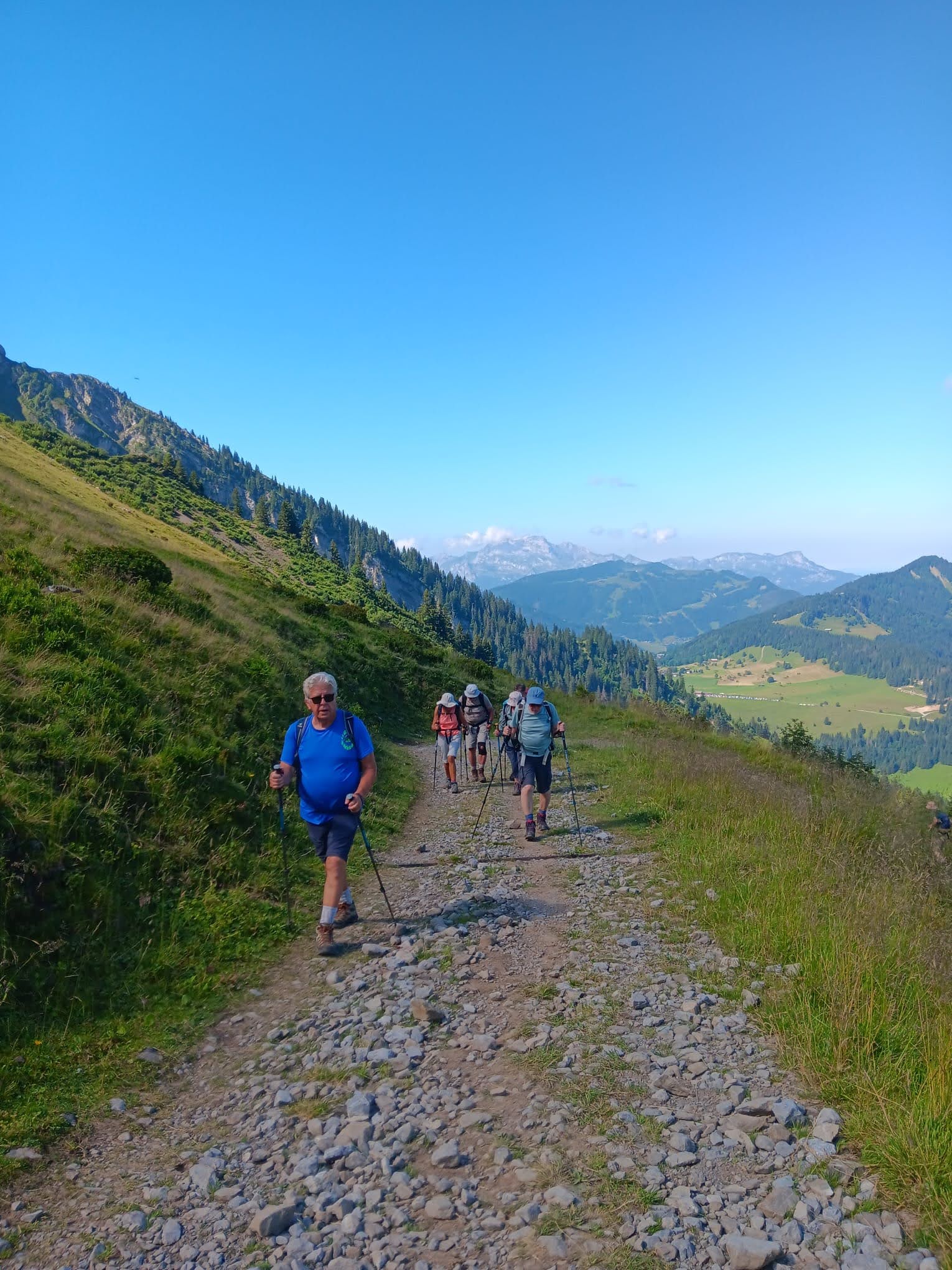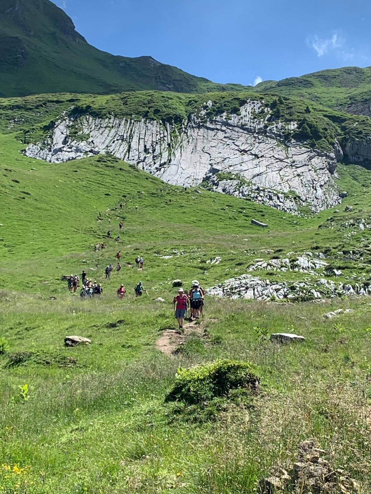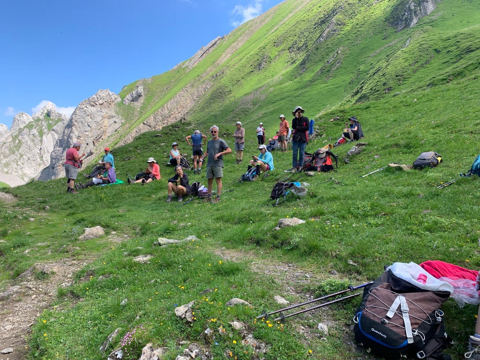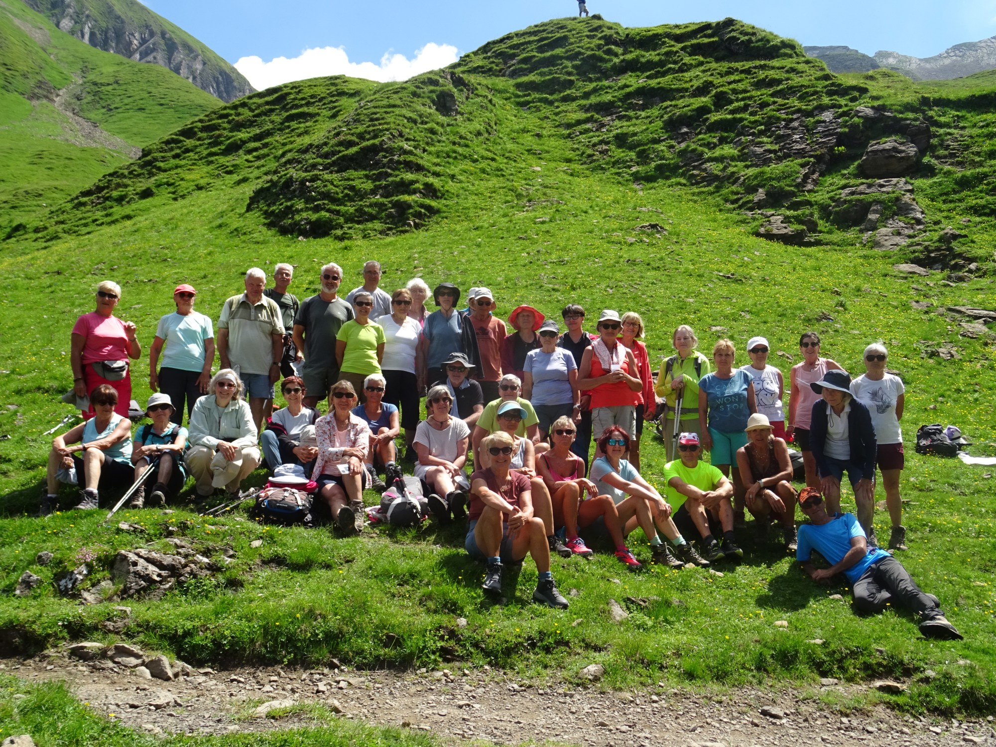 53 randonneurs répartis en 3 groupes pour une randonnée dans les Aravis au départ des Confins à La Clusaz; Chacun suivant ses envies ou aptitudes ont pu gravir les pentes couvertes de fleurs multicolores pour atteindre le lac de Tardevant. Faute de temps, les plus aguerris n’ont pas pu grimper jusqu’à la pointe de Tardevant. En revanche, ils ont pu faire la boucle par le refuge de Bombardellaz.