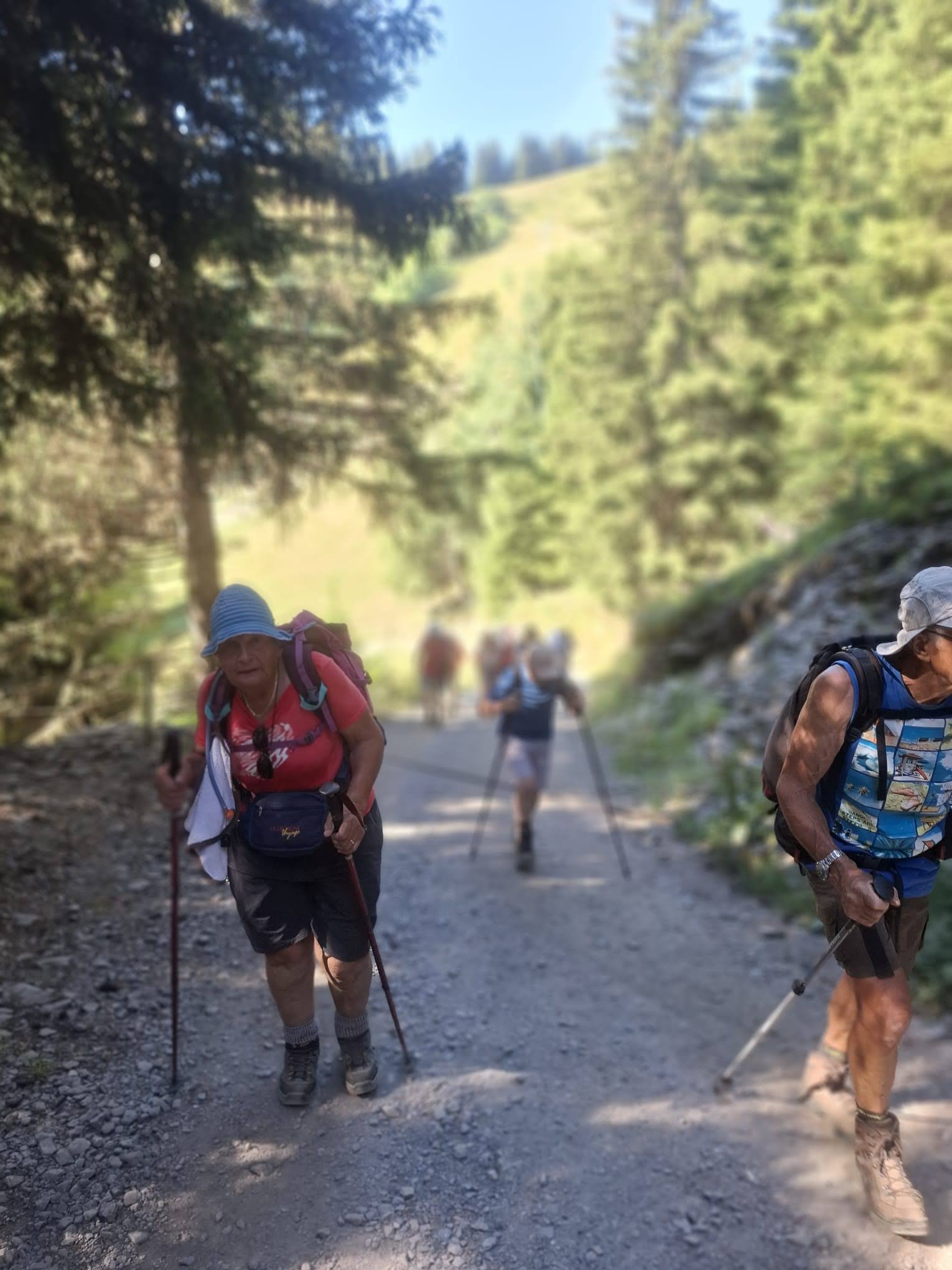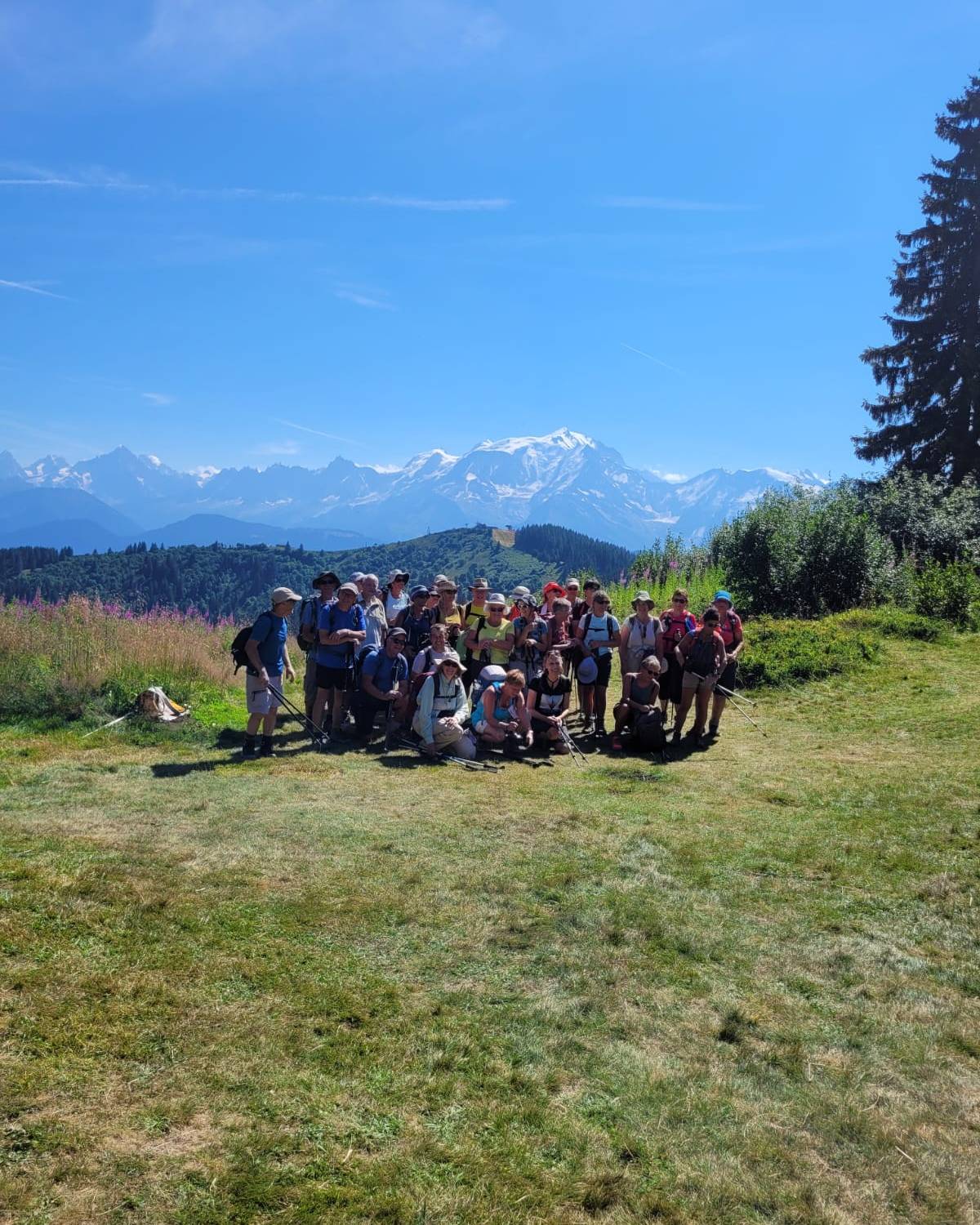 au départ de Saint Martin pour une sortie en direction de Combloux en Haute-Savoie. 2 groupes ont été constitués pour une randonnée sur les hauts de la station de Combloux et ont atteint le col du Jaillet pour le pique nique à l’ombre des sapins. Le décor était somptueux avec la chaine du Mont Blanc immaculée et sans nuages d’un coté et le massif des Aravis de l’autre. Randonnée quelque peu éprouvante sous la canicule mais atténuée par l’ombre des forêt