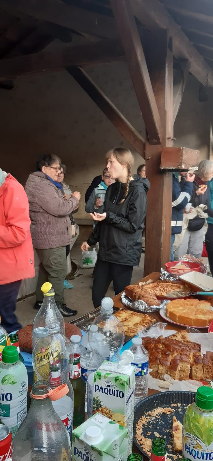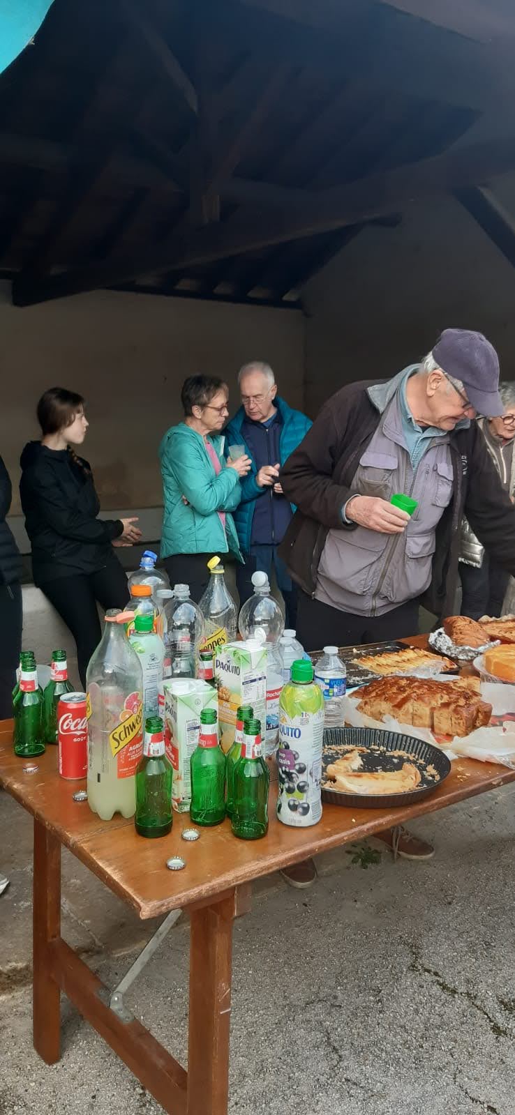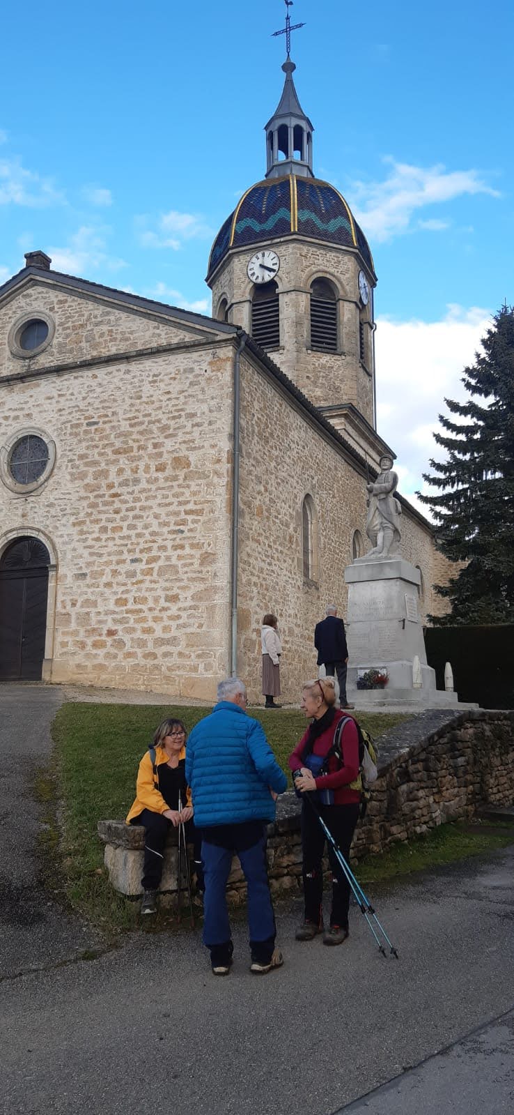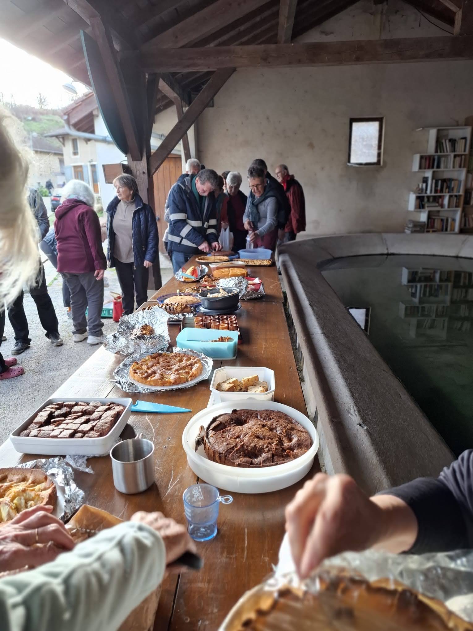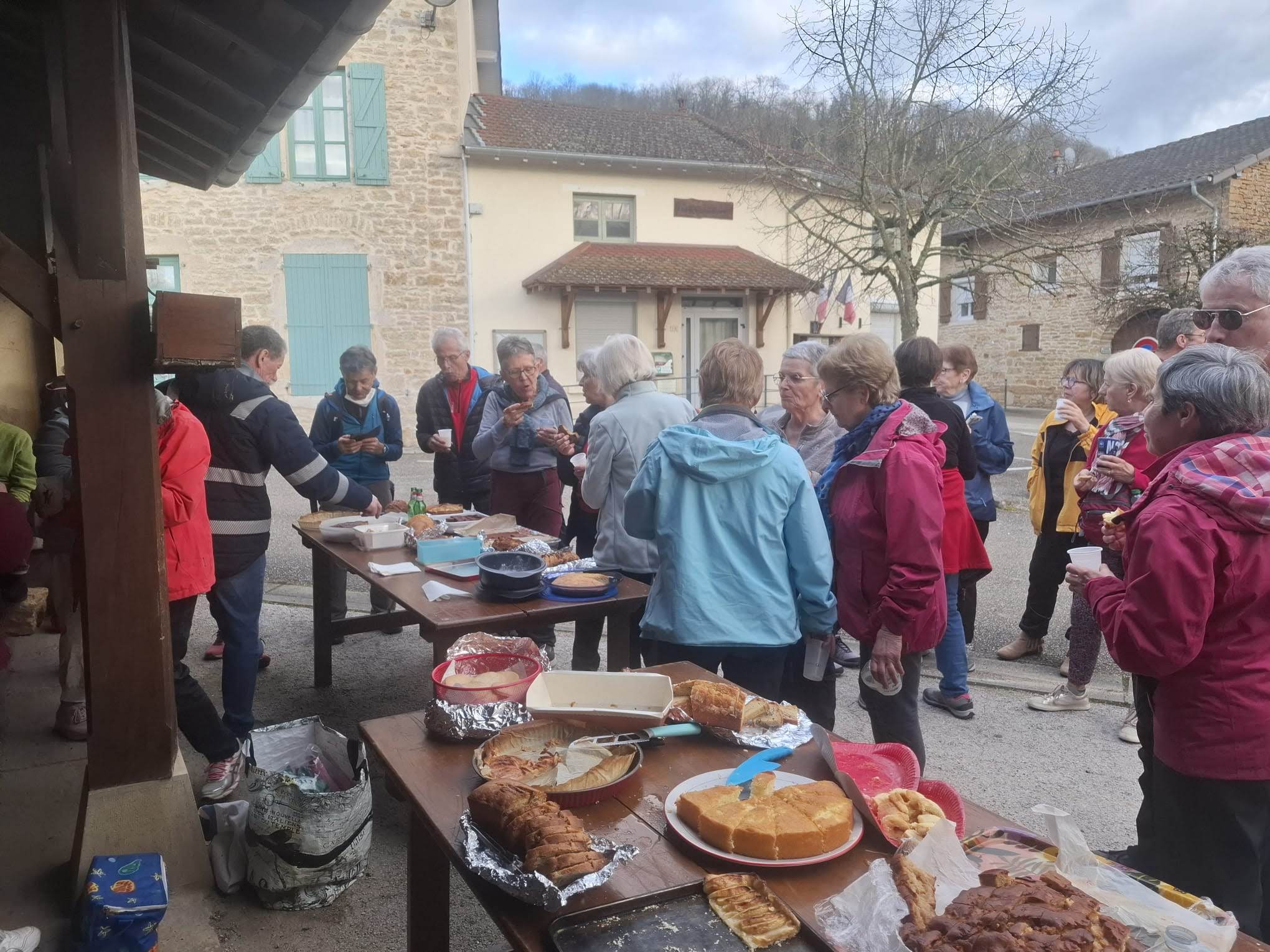 Les randonneurs ont arpentés les chemins autour du village de Salavre avec des beaux points de vue sur la Bresse et sont revenus au point de départ pour la traditionnelle et conviviale dégustation de gâteaux faits maison sous le lavoir du pittoresque village avec son clocher aux tuiles vernissées et aux maisons en pierres dorées.