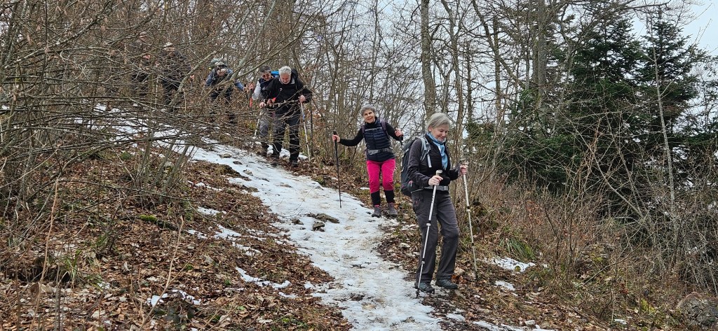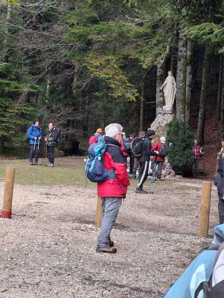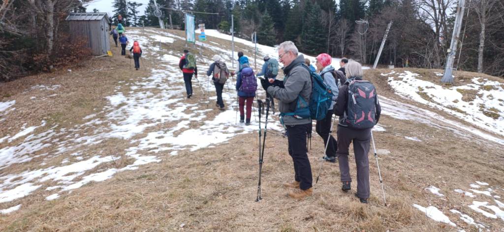 La sortie « raquettes » prévue au calendrier s’est transformée en sortie pédestre vu l’enneigement très limité sur le plateau d’Hauteville. 45 randonneurs répartis en deux groupes sont partis de La Praille en direction de Tête Ronde jusqu’au belvédère de Cornillon.