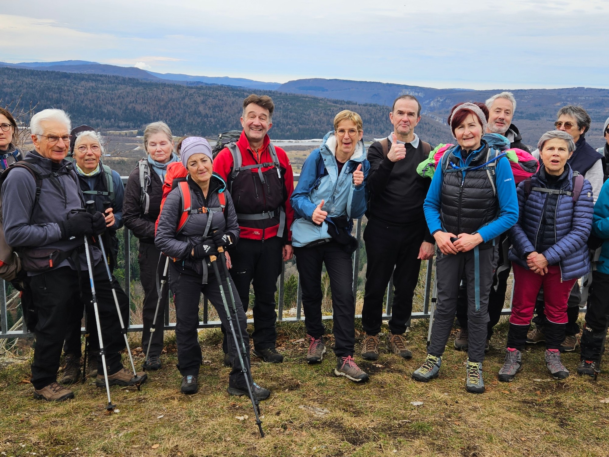 La sortie « raquettes » prévue au calendrier s’est transformée en sortie pédestre vu l’enneigement très limité sur le plateau d’Hauteville. 45 randonneurs répartis en deux groupes sont partis de La Praille en direction de Tête Ronde jusqu’au belvédère de Cornillon.
