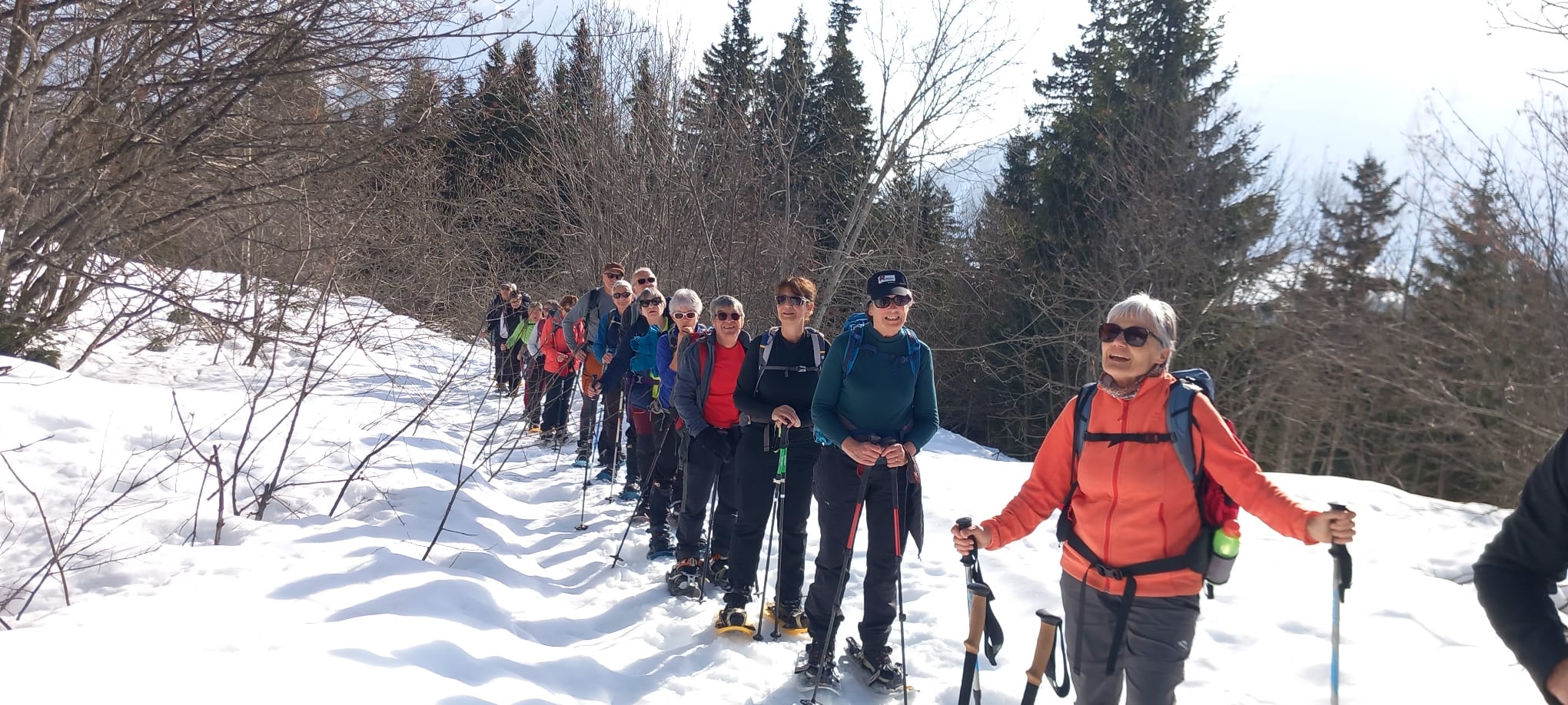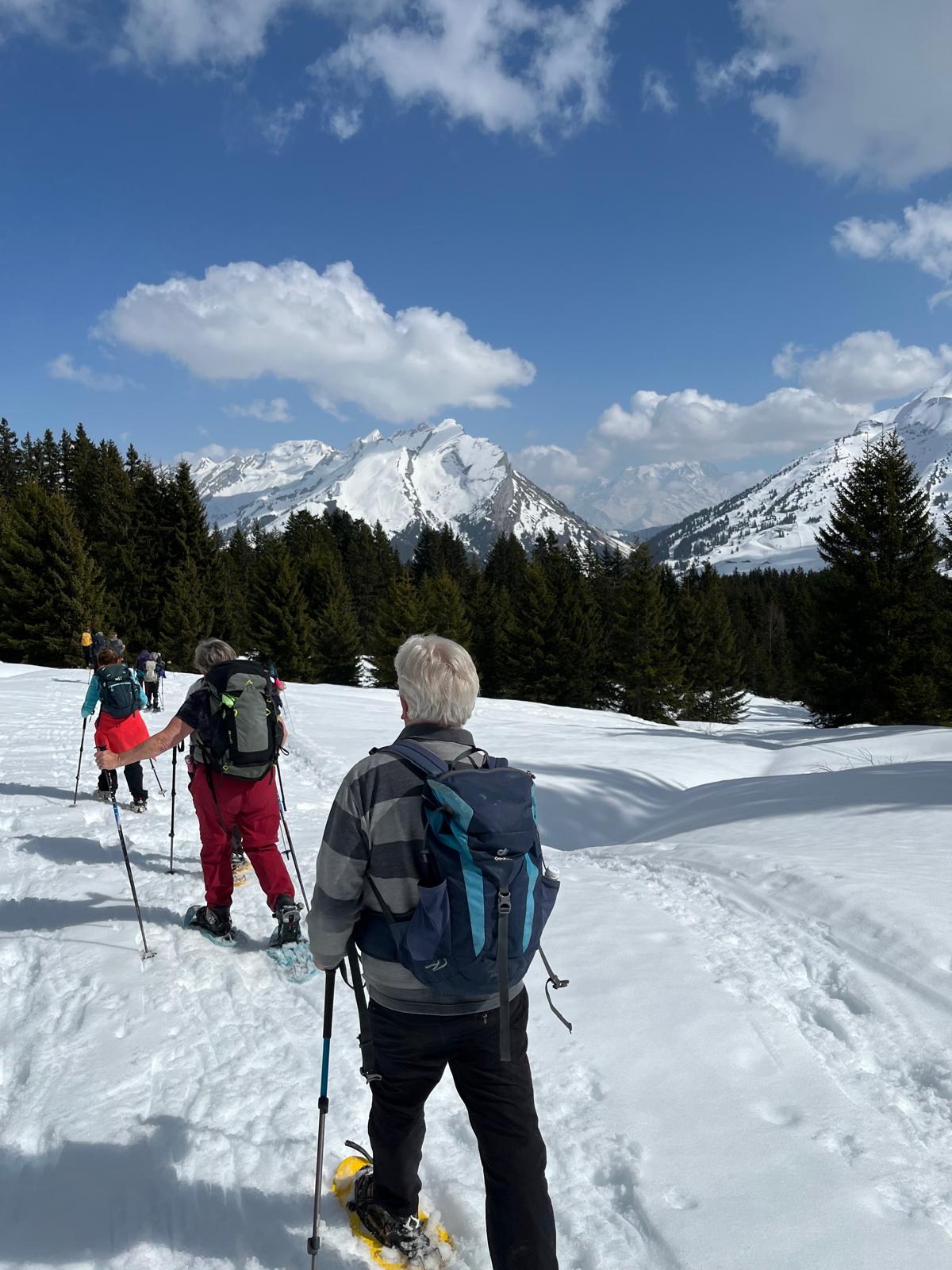 20 participants au mini-séjour « Raquettes » avec pour camp de base le Village-Vacances AEC de Saint Jean de Sixt en Haute Savoie sous une météo printanière très ensoleillée.