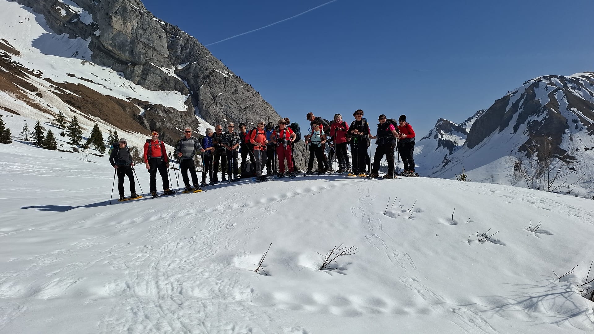 20 participants au mini-séjour « Raquettes » avec pour camp de base le Village-Vacances AEC de Saint Jean de Sixt en Haute Savoie sous une météo printanière très ensoleillée.